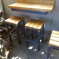 Voici un modèle faisant partie d'un ensemble table banc et plan de travail alliant le fer et le bois.