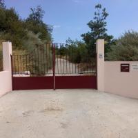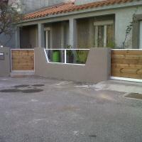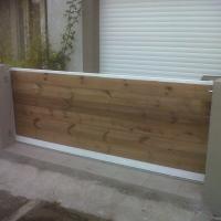 Ensemble composé d'un portail coulissant, de barrières de murets et d'un portillon de bois.