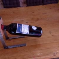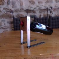 Porte bouteille fer et bois tenant la bouteille en suspension.